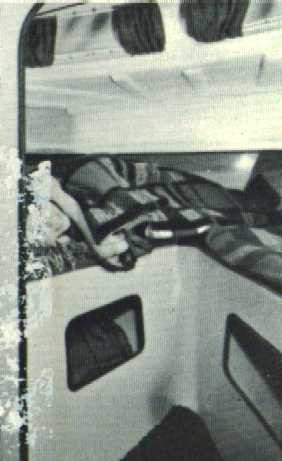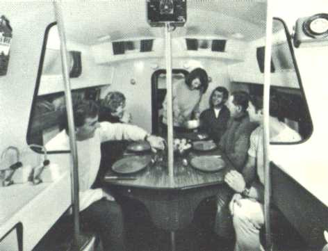 Headroom 4'10". Sitting headroom 3' (914). Berths 6'4" with stowage under. Sail locker. Locker Volume 29cu-ft (.57). Shelf Area 9sq-ft (.84) round cabin sides. |