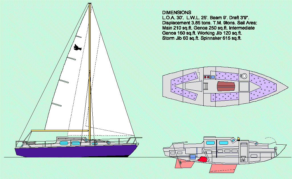 Twin keels symmetrical hydrofoil section. Construction ¼" (6.4) steel plate. Weight 560lbs (258) per keel. Ballast lead ½ ton (508) per keel. Total weight of keels 1 ½ tons (1524). Total fuel capacity 60 gallons (270). Keel fastening ½" (12.7) diameter stainless steel bolts through steel plates moulded into the hull. 30 bolts per keel. Rudder blade glass fibre. Rudder shaft 1 ¼" (32) diameter solid stainless steel. |